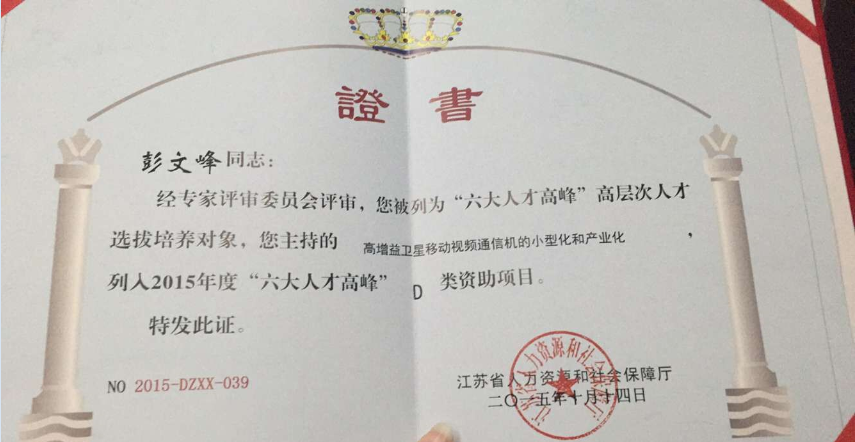 2015年10月14日,由彭文峰同志主持的“高增益卫星移动视频通信机的小型化和产业化”入选为2015年